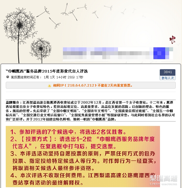 据网络统计,梨温高速鹰潭西收费站2015年“巾帼鹰西”服务品牌形象代言人活动参与人数众多,活动开展2天来,参与网络投票的人数已飙升至3841人。