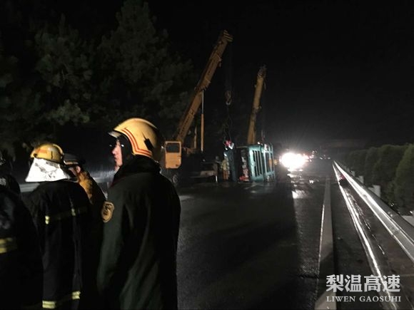 12月4日23:30分,杨梅岭养护所接交警通知,梨温高速K578+600左幅发生一辆大货车与一辆装载18吨危化品的槽罐车发生追尾的事故,装有危化品槽罐车侧翻,并有可能引发化危品泄露,情况十分紧急,养护所迅速组织抢险应急队伍赶赴现场。