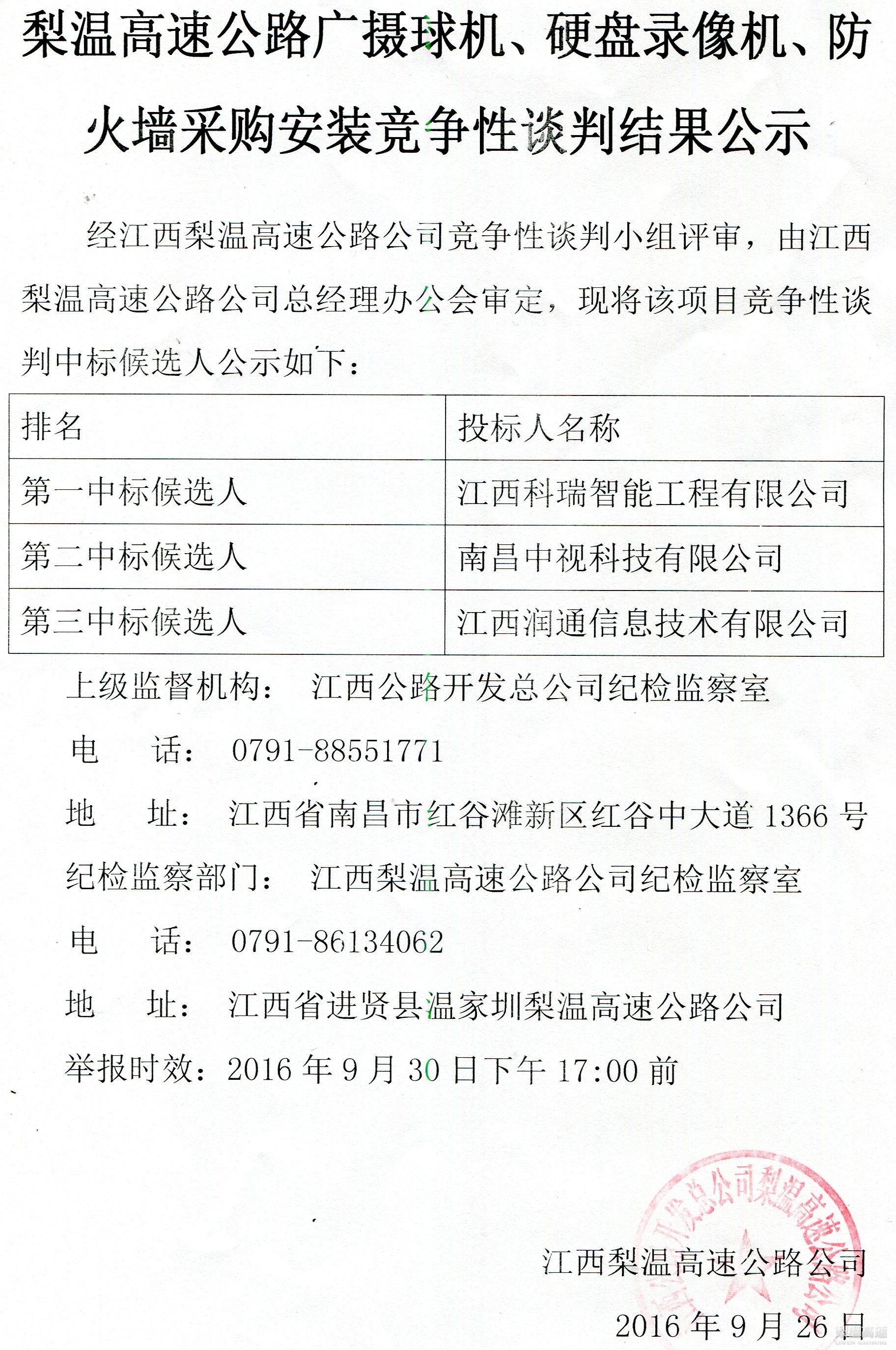 关于广摄球机、硬盘录像机、防火墙采购安装竞争性谈判结果的公示