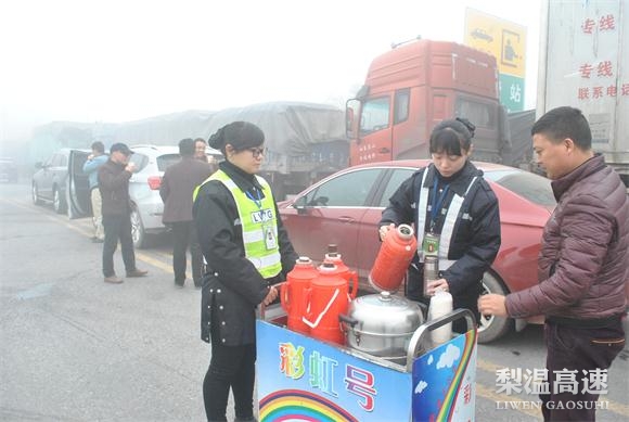 早上7点,鹰潭西收费站的路上能见度不足50米,入口已禁行了近6个小时,收费广场滞留的车辆逐渐增多。站里的姑娘们推出“彩虹号服务车”,为司乘朋友送去了开水、姜茶和感冒药等物品。司乘接过暖暖的开水和姜茶,喝完之后捂杯暖手,相互交流,一位来自苏州的黄姓司乘更是憨实的说到:“等了一晚上,冷的我直咳嗽,喝杯姜茶好多了,你们的服务真温馨,谢谢啊!”大雾不见散去,姑娘们每半个小时一趟,推着“彩虹号服务车”穿梭于迷雾里、车流中,为滞留司乘提供力所能及的服务和帮助。