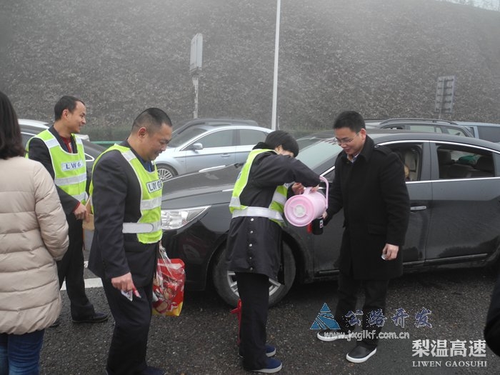 工作人员为滞留司乘人员免费提供开水、方便面等应急食品,热心询问司乘需求,并耐心向司乘人员解释交通管制原由,安抚司乘焦虑急切情绪,劝导司乘耐心等待,帮助有急事的司乘选择其他线路,绕行避开封道区域。