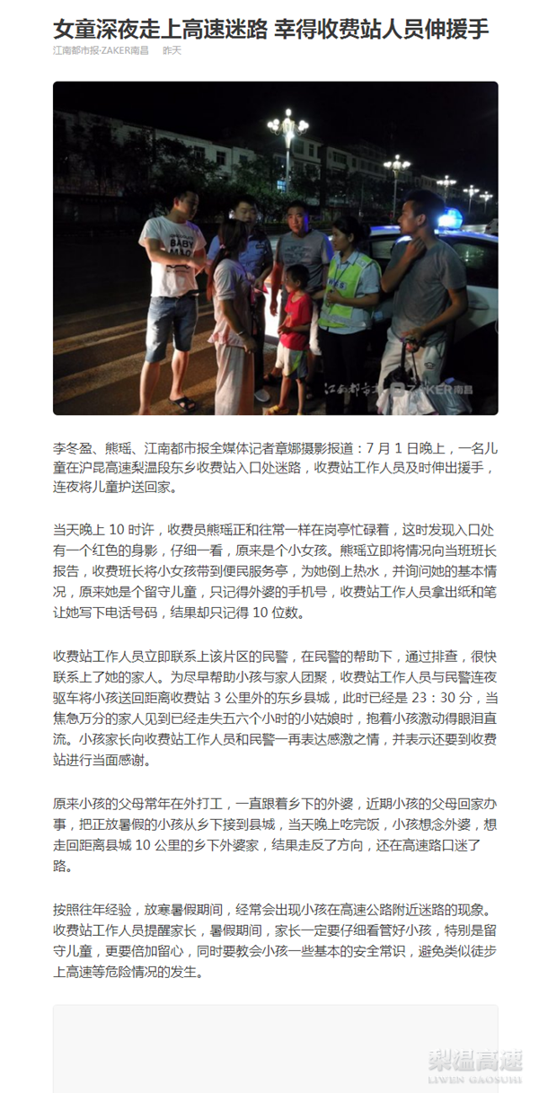 【江南都市报】女童深夜走上高速迷路 幸得收费站人员伸援手