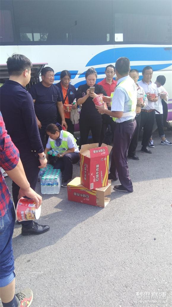 车上30多名乘客已经受困七八个小时,饥肠辘辘,情绪焦躁。了解到此情况后,班长立即将情况上报值班站长。值班站长到达现场后,组织人员安抚旅客,同时将方便面、饼干、矿泉水等站应急物资分发给滞留旅客。而随便气温的升高,乘客都下车聚集在出口广场,此时正值国庆假期车辆返程高峰,为保证乘客安全,值班站长将所有乘客安置在大会议室休息,并为他们提供开水、手机充电等服务。