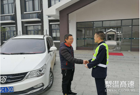 由于收费站工作人员的及时帮助,车主才能联系上出租车司机,找回遗失物品,车主临走时握手表示感谢!(兰生旺)