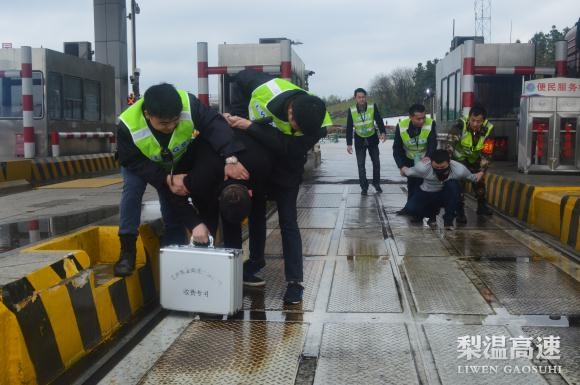 收费员看到这种情况,及时反应并喊道“有人抢劫!”,岗亭内的收费员见状立即用脚踏式报警器通知监控员。监控员得到消息后立即打开警铃并向收费班长和值班领导报告,周围及站内人员听到警铃后立即奔向“事发”车道,通过大家的共同协作,最终将“歹徒”控制,演习结束。