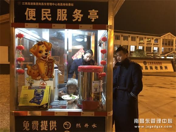 2月10日晚,南昌南管理中心南昌南收费所值班领导在收费广场视察春运车情时,在所大门外路灯下发现一名衣着单薄、身材矮小、满头白发的老人,室外寒风凛冽,收费广场车流量又大,为了避免老人受冻或者再发生其他意外情况,该所负责人及时把老人请进便明服务亭,倒上热水,并安排食堂煮来一碗热气腾腾的面条。