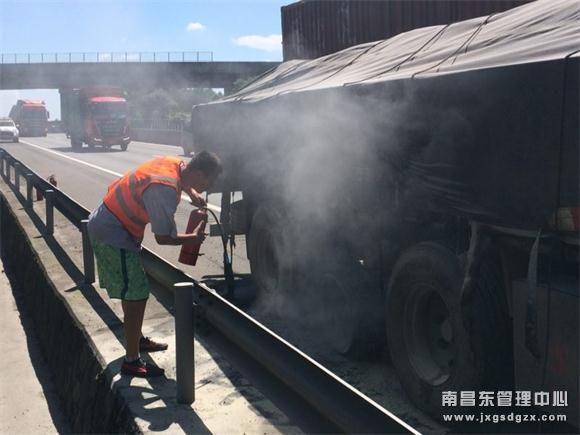 7月18日下午2时20分许,南昌南管理中心东乡养护所清障救援队的路面巡查人员在沪昆高速(梨温段)K499+200往上海方向,发现一辆江苏牌照重型半挂车后排轮胎冒烟起火。该队员奋勇当先、果断处置,及时扑灭火情,快速消除了一起危及道路通行安全的隐患。