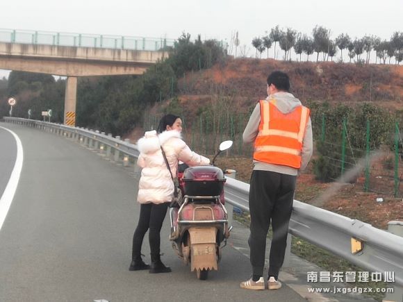 近日,江西交投集团南昌南管理中心罗湖养护站技术员正在进行日常巡查时,发现一名青年女子推着一辆电动车在高速公路上吃力地行走,养护站技术员迅速下车向该女子询问情况。