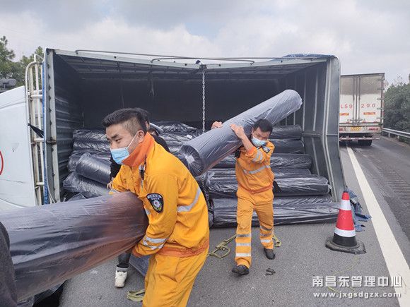 据悉,该中队当班人员接到报警后赶赴事故现场,抵达现场后,发现一辆满载布料的小货车“横躺”在2个车道中间,一车布料散落在路面上,现场一片狼藉。此时,正值车流高峰,事故地点距离三清山服务区1公里,已后方造成6公里拥堵,当务之急是恢复路面通行,避免后方产生事故。于是,做好后方安全围蔽后,现场所有人员齐心协力,一个手扛一个,先将单个重达100斤的布料搬运至应急车道,随后使用随车吊将车辆扶正,11点35分,他们成功将超车道和行车道恢复通行。