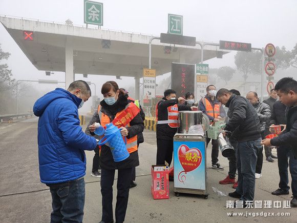 早上7时,南昌南收费站入口还未解除交通管制,而滞留的车辆和人员越来越多,由于天气还比较寒冷,考虑到大家还没有吃早饭。该站志愿者服务队推着“平安号”便民服务车走进了人流中,为滞留的司乘们送去冬日里的温暖。