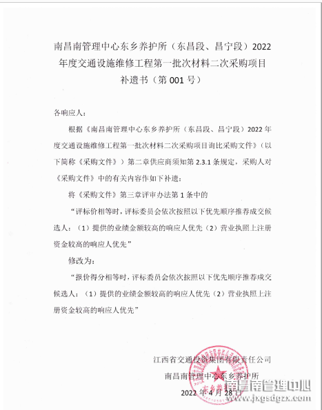 南昌南管理中心东乡养护所(东昌段、昌宁段)2022年度交通设施维修工程第一批次材料二次采购项目补遗书(第