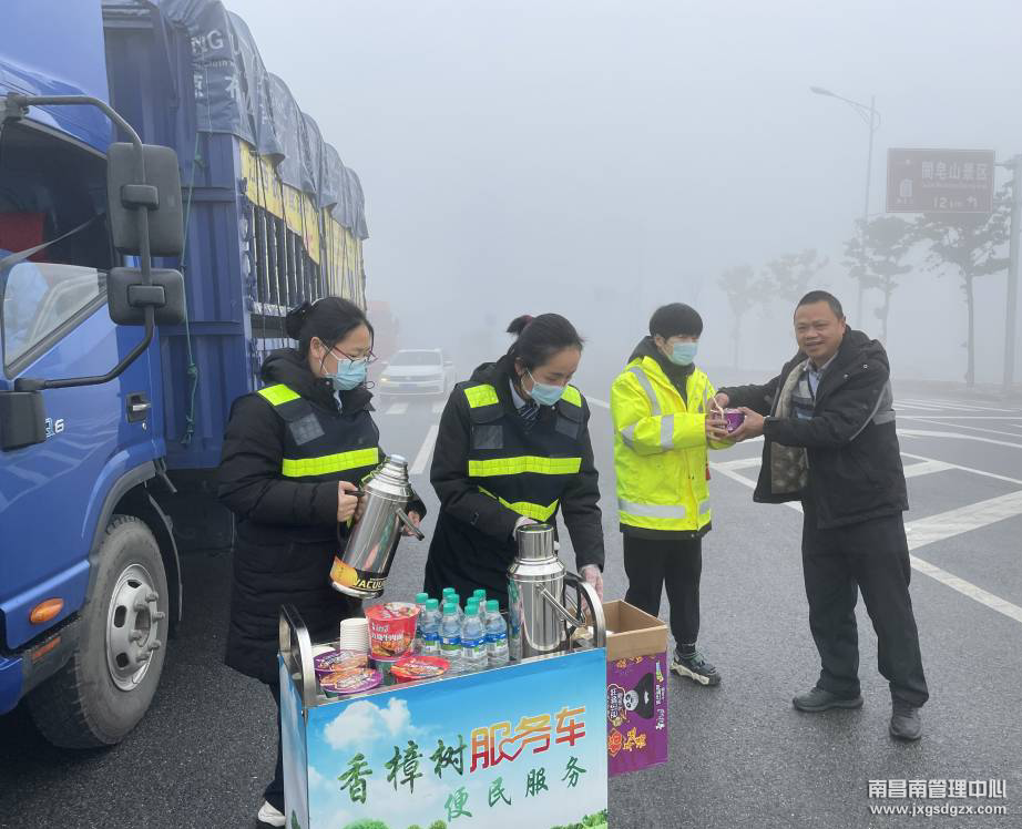 2022年2月24日凌晨,受大雾天气影响,南昌南管理中心东昌高速樟树东收费所各站入口实行交通管制。该所立即启动恶劣天气保畅应急预案,开展便民服务,积极主动为因大雾天气滞留的司乘人员提供开水、方便面、维修工具、路线指引等服务,得到了广大司乘一致好评。
