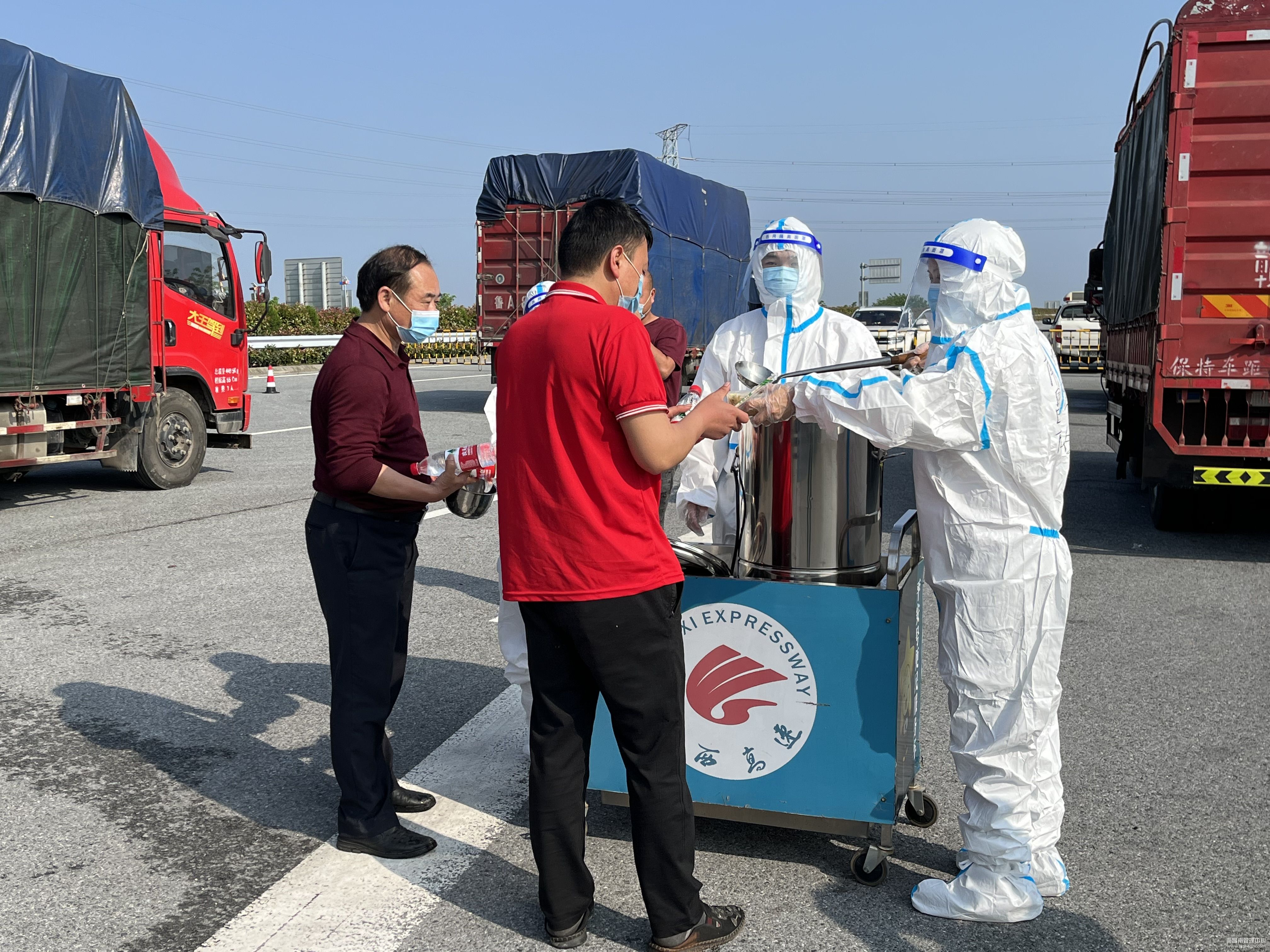 因南昌市实施静态管理,4月24日上午7时,南昌南管理中心南昌南收费站广场出口处滞留了多辆下高速货车,该站组织开展便民服务。