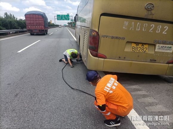 此时高速路面温度高达40余度,被迫下车的54名乘客站在应急车道处头顶烈日,略显急躁不安。该大巴车司机表示,旅游公司已经从南昌调度另一辆大巴前来接走54名乘客去葛仙山旅游,大约需要一个半小时,故障大巴换好备胎后由他驾驶返回南昌。为了安全起见,该中队救援人员立即将所有乘客护送到边坡下的树荫处等候,耐心安抚乘客情绪,为他们讲解了一些高速突发事故或故障时该如何解决。