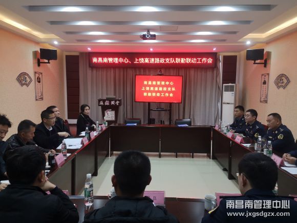 1月18日,南昌南管理中心联合上饶高速路政支队在上饶收费所召开联勤联动工作会,中心副总经理吴成钢、收费部、安监部负责人,上饶高速路政支队相关人员参加会议。