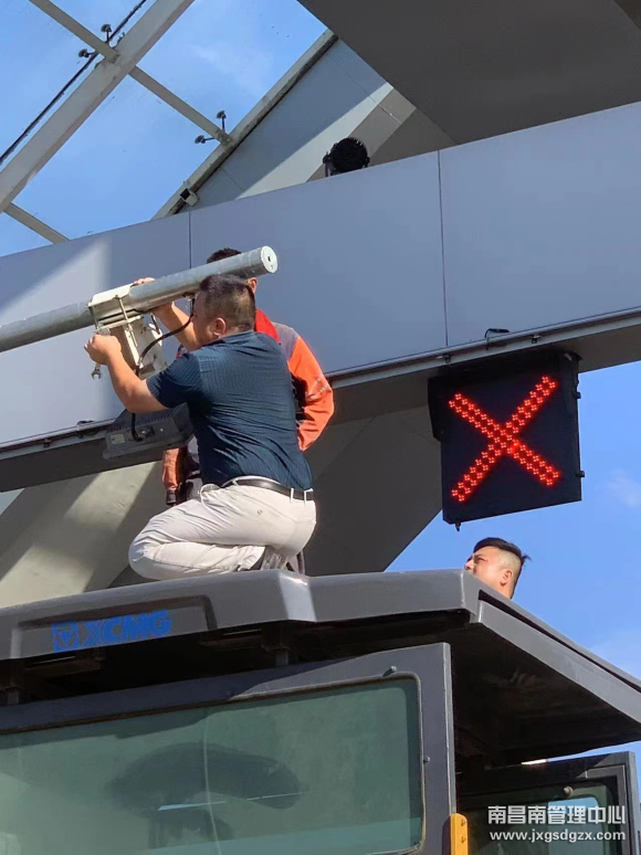 9月14日,南昌南中心进贤收费站快速抢修天线设备,确保车辆正常通行。