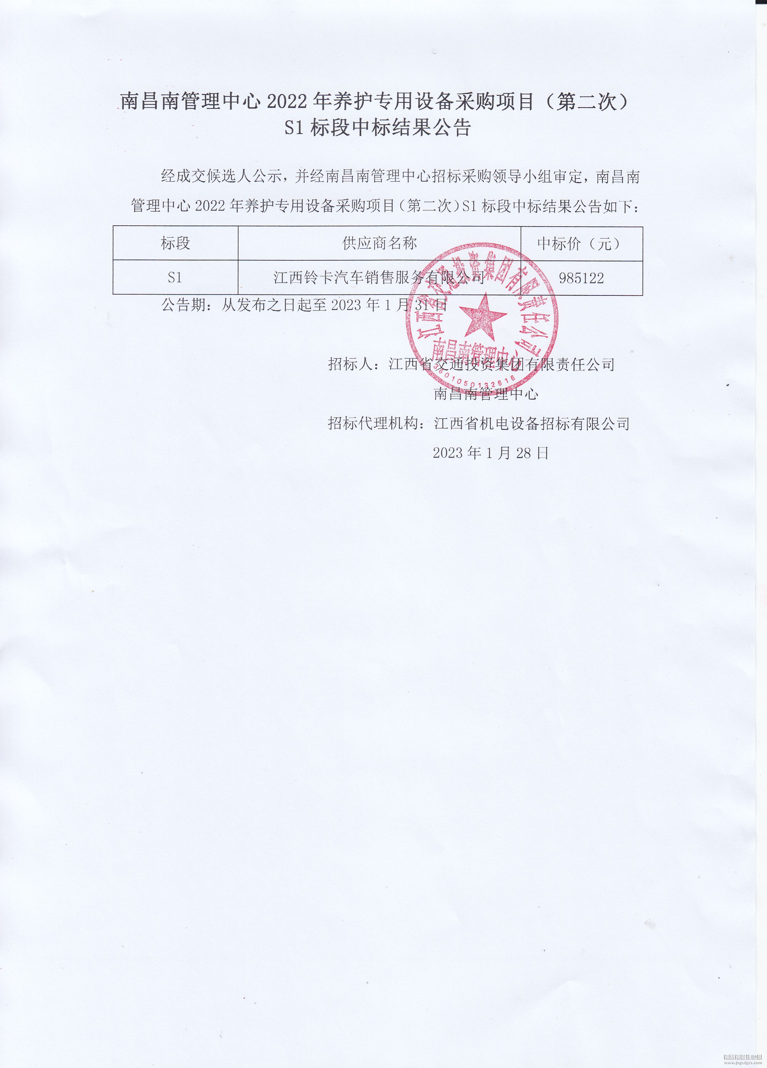 南昌南管理中心2022年养护专用设备采购项目(第二次)S1标段成交结果公告