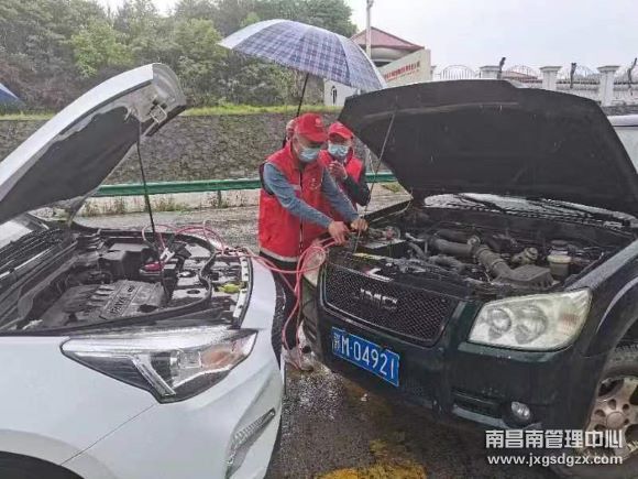 余江收费站:车辆电瓶亏电熄火 工作人员搭电施救