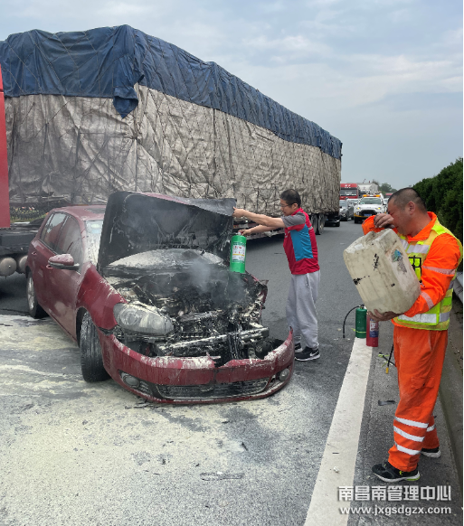 5月3日上午11时许,在沪昆高速梨温段南昌方向K542公桩处,一辆红色轿车因追尾事故导致引擎盖着火,江西省交通投资集团南昌南车辆救援大队杨梅岭中队负责人徐志勇恰巧巡路经过,他迅速使用灭火器将明火扑灭,整个过程仅用了12分钟,现场未造成人员伤亡。