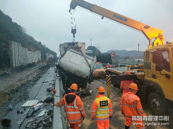 前车小型货车被撞在中央隔离带护栏,后车冷藏车则车头车身分离受损严重。经了解,因为暴雨天气,视野不佳,导致发生了追尾,2名受伤人员已被送往医院。救援员确定救援方案后,立即展开救援作业。为快速处置事故现场,保障道路快速恢复畅通,先使用吊车将南昌方向路面的中分带碎片清理干净,16时10分,路面碎片清理干净,南昌方向道路恢复通行。