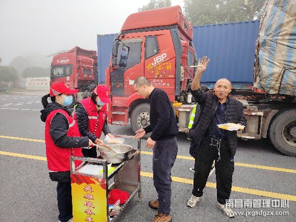 “师傅,我们食堂准备了早餐,先吃点垫垫肚子,等雾散了再赶路……”在南昌南管理中心玉山收费站外广场,“高速映山红”的小红帽们正热情地邀请因大雾滞留现场的司乘用餐。