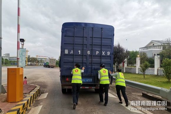 了解情况后,工作人员一边安抚司机的情绪,一边通过对讲机联系班长龚芳平,说明现场情况。了解情况后,龚芳平迅速带领两名班员赶到现场,大家分工协作,一人在来车方向摆放好警示标志,引导后续车辆减速绕行,其余三人化身“推车侠”合力帮助司机推车。