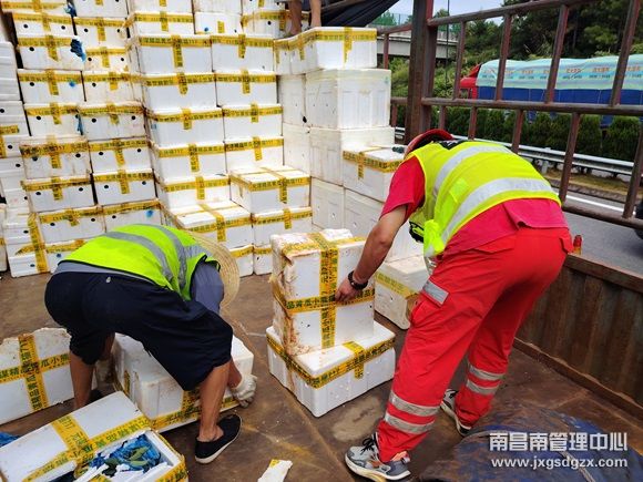 当天5时35分,彭师傅驾驶车辆行驶至东昌高速东乡方向K76公桩处时,由于右前轮爆胎导致失控,侧翻在高速公路边坡上,满载的黄瓜从破损的泡沫箱中滚落,散落一地。南昌南车辆救援大队罗湖中队接到电话后,立即赶赴事故现场。